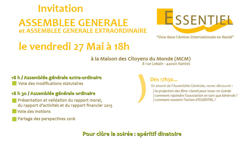 L’association ESSENTIEL a le plaisir de vous inviter à son Assemblée Générale le vendredi 27 mai 2016 à 18h. Cette année, l’AG se double d’une assemblée générale extra-ordinaire qui vise à modifier certaines dispositions statutaires.