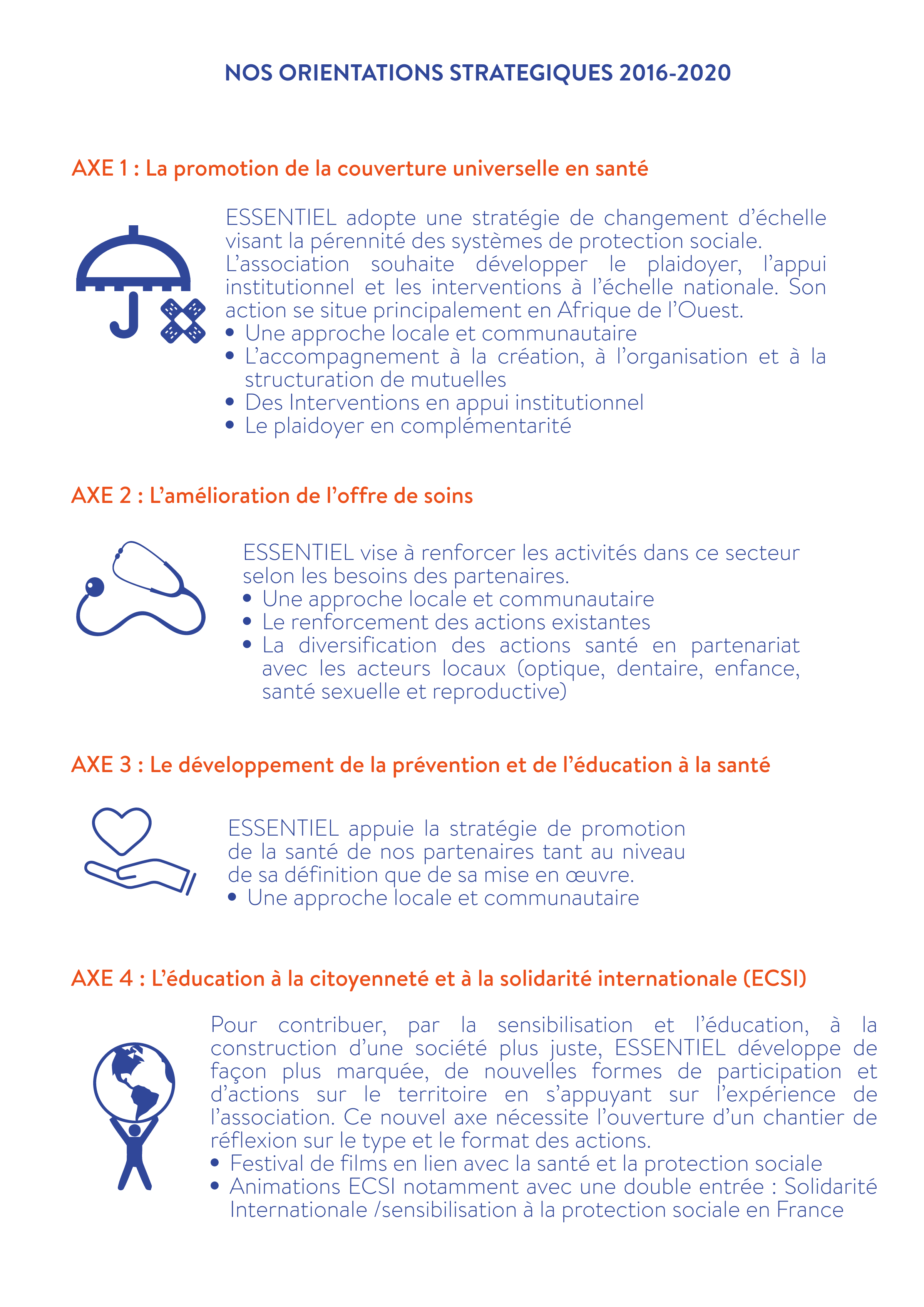 L’ambition de l’association Essentiel est d’agir pour un monde plus juste et solidaire où chacun peut jouir d’une bonne santé et préserver son bien être ainsi que celui de sa famille en ayant accès à la prévention et à des soins de qualité.